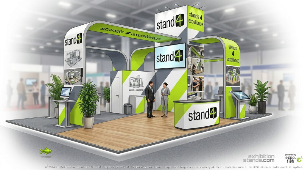 It’s all about those sleek, sweeping curves and a massive central tower built to grab attention from across the room. It’s got a great mix of open space for mingling and dedicated spots for demos, all tied together with some greenery to keep the vibe fresh.